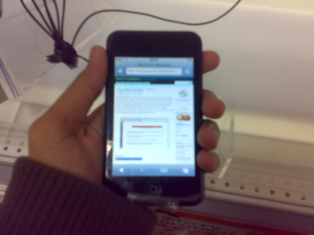 Sempat juga aku merasai kehebatan ipod touch ni dan membuatkan hati aku berdebar-debar samada membelinya atau tidak.Nasib baikla masa tu aku tak bawak duit kalau tak lesapla dalam sribu duit aku.Huhu..Apa yang best dalam sepintas lalu aku bersama ipod touch ni ialah, fungsi yang boleh memainkan video dalam youtube secara online dan boleh didownload terus ke ipod.Disamping itu,terdapat browser safari yang membolehkan kita connect kepada internet, membuka laman web, dengan syarat terdapat wifi connection(kalau xsilap aku).Oleh kerana kedai tu mungkin dilengkapi dengan wifi,maka tampa segan dan silu aku browse blog melayubuntu ni menggunakan ipod touch.Ini gambarnya;